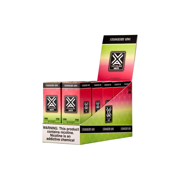 NICOTINE SALTS | PACK OF 10 Flavor Strawberry Kiwi VaporLax Nic Salt vape juice is a sweet, fruity mix of ripe strawberry and exotic kiwi flavors. E-liquid contents : 30mL Nicotine Strengths : 25mg and 50mg Blended for use with Pod Systems View VaporLax Salt's PMTA Submission Browse more E-Liquid Brands Here