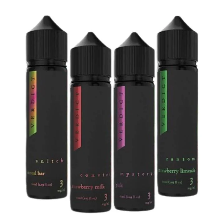 Elevate your vaping experience with Verdict E-Liquids. Each 60ml bottle offers smooth, bold flavors and comes in nicotine strengths of 0MG, 3MG, and 6MG, catering to both beginners and seasoned vapers. Perfect for vape stores and smoke shops, these delicious blends deliver exceptional taste in every puff. Flavors: Convict: Creamy strawberry milk that satisfies your sweet tooth. Mystery: A surprise flavor with a fruity twist. Ransom: Refreshing strawberry limeade with a zesty kick. Snitch: Crunchy cereal bar nostalgia in a vape. Warden: Smooth hazelnut pecan butter for a rich, nutty finish. Experience Verdict E-Liquids today for the ultimate flavor satisfaction! Shop Verdict Vapors E-Liquid Retail.