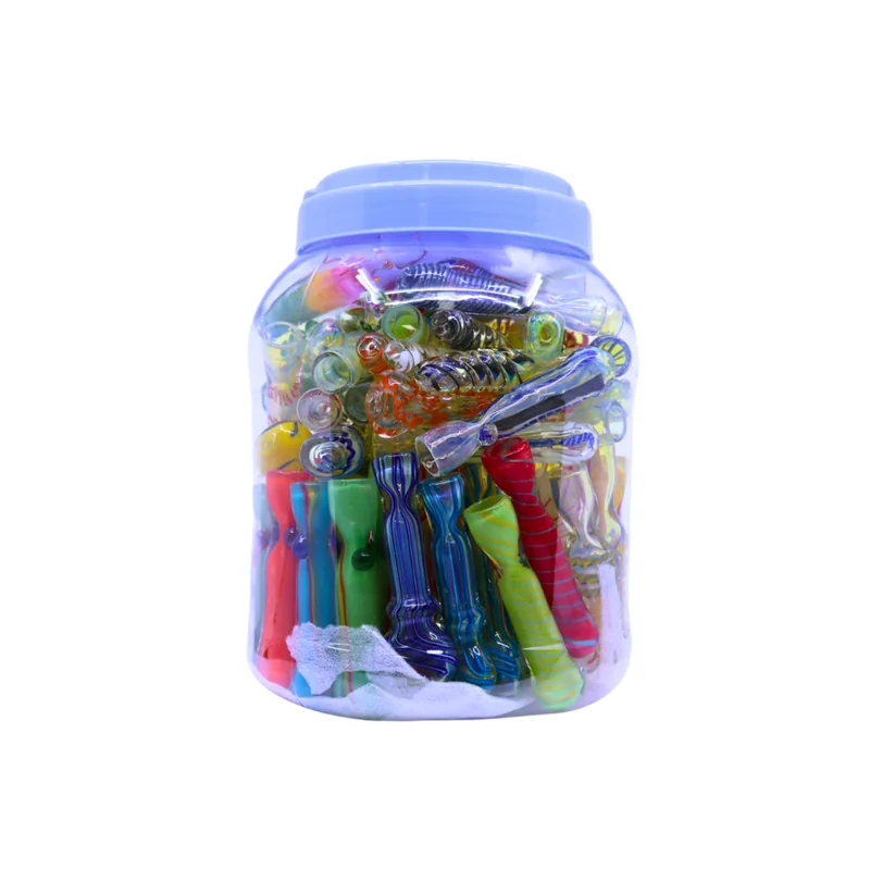 GLASS MIX DESIGN 3" CHILLUM JAR OF 100 (JAR-63) Introducing the 3" Glass Mix Design Chillum Jar of 100 (Jar-63) , a versatile assortment of high-quality chillums designed to enhance your smoking experience. Each jar contains 100 chillums, featuring a variety of unique designs and patterns. Crafted from premium glass, these chillums offer durability, functionality, and aesthetic appeal, making them perfect for personal use or display in smoke shops. Unique Designs: Each chillum boasts a distinct
