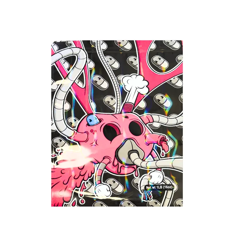HOLOGRAPHIC MYLAR 1 LB BAGS 25CT HEART VALVES DESIGN Bring bold, edgy appeal to your packaging lineup with the Holographic Mylar 1lb Bags – Heart Valves Design, 25ct Pack . Featuring a striking holographic finish with a Heart Valves–themed design , these oversized bags combine unique novelty style with professional-grade bulk storage performance . Each bag holds 1 pound (16 oz) , making it ideal for bulk flower, edibles, or wholesale cannabis products . Constructed with heavy-duty, smell-proof,