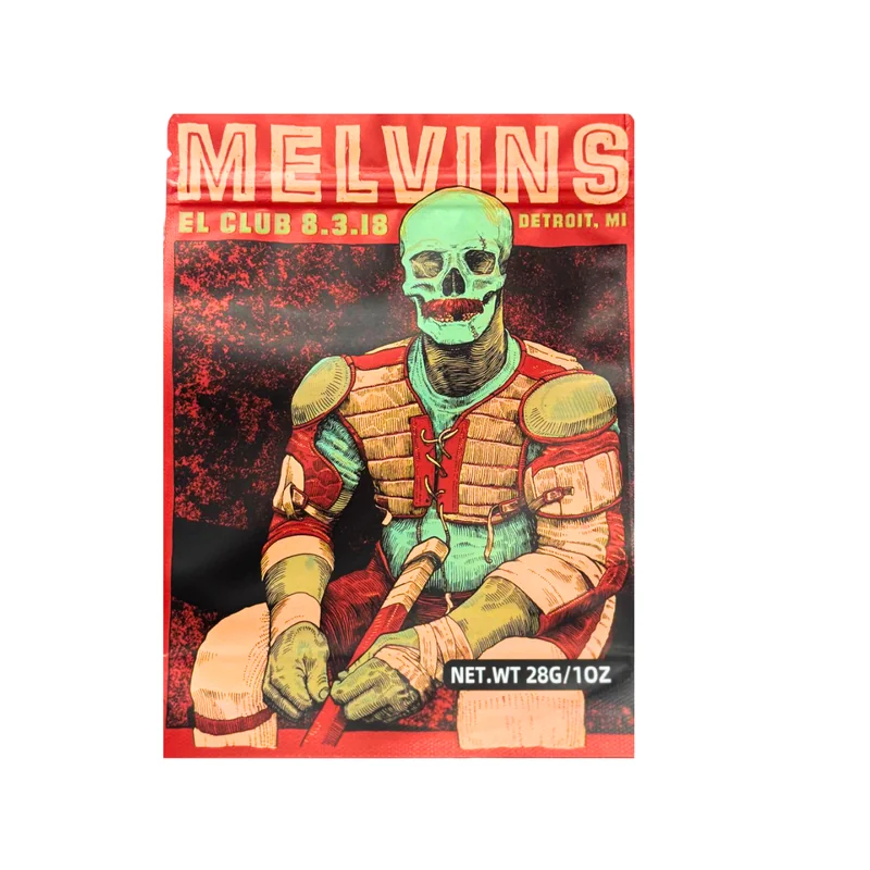 HOLOGRAPHIC MYLAR 28G BAGS 50CT MELVIN'S DESIGN Stand out on the shelf with the Holographic Mylar 28g Bags – Melvin's Design, 50ct Pack . Featuring a vibrant holographic finish with a Melvin’s-inspired theme , these premium-quality bags offer a blend of novelty artwork and professional storage reliability . Each bag is sized for 28 grams (1 oz) , making it perfect for bulk packaging of flower, edibles, or specialty products. Constructed from smell-proof, resealable, and durable materials , they