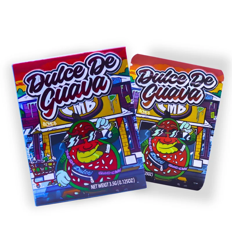 HOLOGRAPHIC MYLAR 3.5G BAGS WITH BOXES 50CT DULCE DE GUAVA DESIGN Bring tropical sweetness to your packaging lineup with the Holographic Mylar 3.5g Bags with Boxes – Dulce de Guava Design, 50ct Pack . These premium-quality bags feature a colorful holographic finish with a guava-inspired dessert theme and come with matching display boxes , combining eye-catching presentation with dependable storage functionality . Each bag holds 3.5 grams (⅛ oz) , making it perfect for flower, edibles, or special
