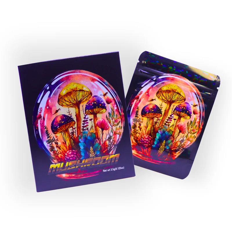 HOLOGRAPHIC MYLAR 3.5G BAGS WITH BOXES 50CT MUSHROOM GLOBE DESIGN Add a cosmic, psychedelic edge to your packaging with the Holographic Mylar 3.5g Bags with Boxes – Mushroom Globe Design, 50ct Pack . Featuring a stunning holographic finish with a mushroom globe–inspired theme , these premium bags come with matching display boxes , combining eye-catching visuals with secure, reliable storage performance . Each bag holds 3.5 grams (⅛ oz) , making it perfect for flower, edibles, or specialty goods.