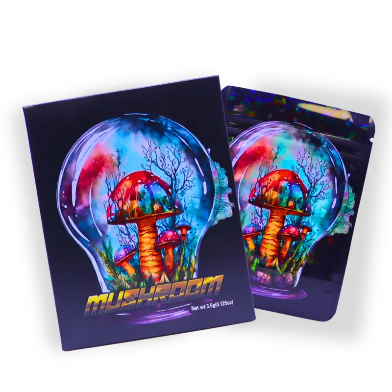 HOLOGRAPHIC MYLAR 3.5G BAGS WITH BOXES 50CT MUSHROOM LIGHT DESIGN Illuminate your packaging selection with the Holographic Mylar 3.5g Bags with Boxes – Mushroom Light Design, 50ct Pack . Featuring a psychedelic holographic finish with a glowing mushroom-inspired theme , these premium bags come with matching display boxes , delivering both eye-catching retail presentation and reliable storage performance . Each bag is designed for 3.5 grams (⅛ oz) , making it perfect for flower, edibles, or speci