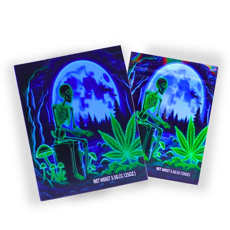 HOLOGRAPHIC MYLAR 3.5G BAGS WITH BOXES 50CT SKELETON LEAF DESIGN Add a bold and eerie twist to your packaging lineup with the Holographic Mylar 3.5g Bags with Boxes – Skeleton Leaf Design, 50ct Pack . Featuring a shiny holographic finish with a skeleton leaf–inspired theme , these premium-quality bags come with matching display boxes , combining eye-catching edgy artwork with dependable storage performance . Each bag is sized for 3.5 grams (⅛ oz) , making it perfect for flower, edibles, or speci