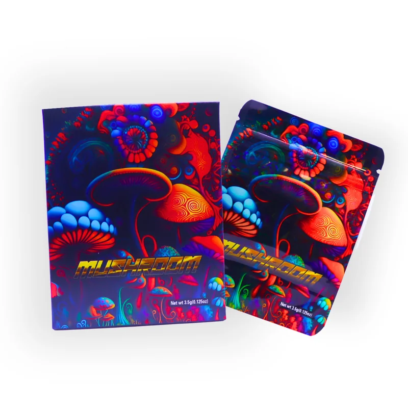 HOLOGRAPHIC MYLAR 3.5G BAGS WITH BOXES 50CT TRIPPY SHROOM DESIGN