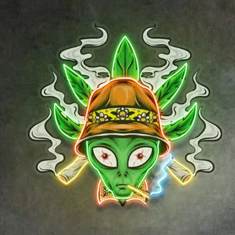 SMOKING ALIEN LED NEON SIGN (23.5 X 22") Add an out-of-this-world vibe to your shop or lounge with the Smoking Alien LED Neon Sign (23.5 x 22") . Featuring a bright neon alien smoking design , this novelty LED sign blends sci-fi appeal with smoking culture , making it a standout decorative piece. Sized at 23.5 x 22 inches , it’s the perfect wall feature for smoke shops, head shops, bars, lounges, and man caves . Built with durable, energy-efficient LED tubing , it provides vibrant illumination,
