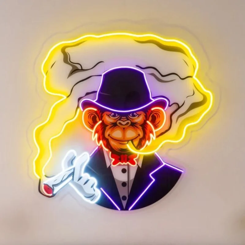 SMOKING MONKEY CIGAR LED NEON SIGN (23.5 X 23") Brighten up any space with the Smoking Monkey Cigar LED Neon Sign (23.5 x 23") . Featuring a fun and eye-catching monkey smoking a cigar design , this novelty neon sign blends retro-inspired style with modern LED technology for a bold decorative piece. Measuring 23.5 x 23 inches , it’s the perfect size for smoke shops, cigar lounges, bars, man caves, and themed retail displays . Built with durable LED tubing , this sign offers long-lasting br