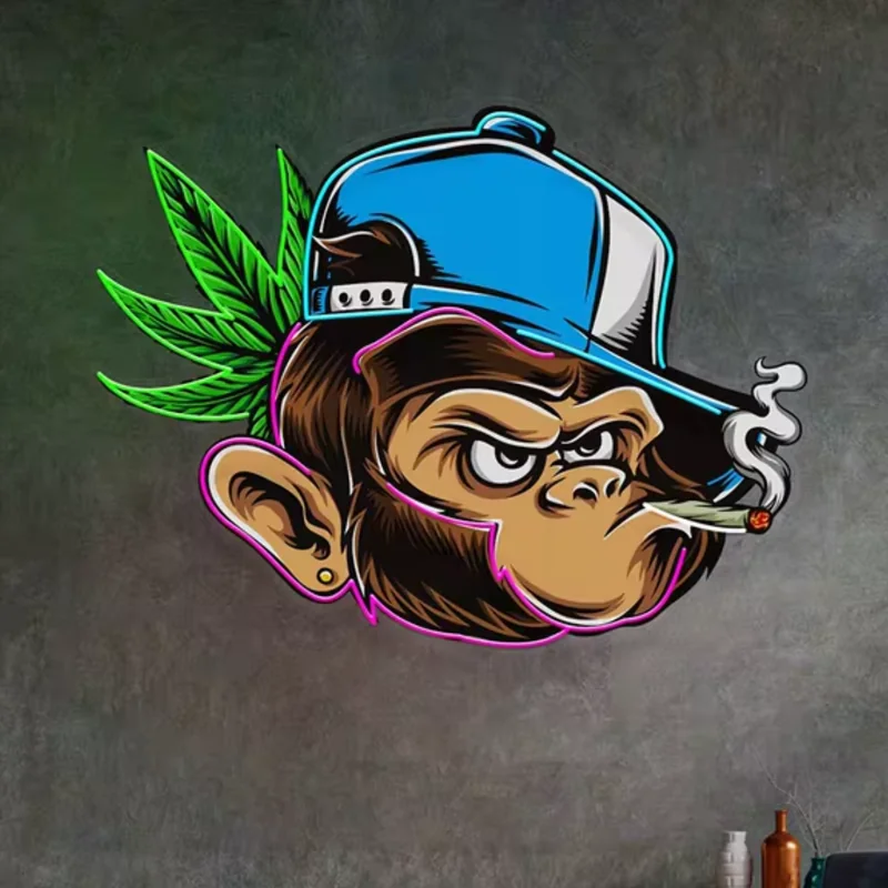 SMOKING MONKEY WITH BLUE CAP LED NEON SIGN (23.5 X 18") Add playful personality to your décor with the Smoking Monkey with Blue Cap LED Neon Sign (23.5 x 18") . Featuring a fun monkey design in a blue cap while smoking , this novelty LED sign delivers bright neon-style illumination with modern LED efficiency . At 23.5 x 18 inches , this sign is the perfect size to stand out while fitting comfortably in most spaces. Built with durable, energy-efficient LED tubing , it ensures long-lasting brightn