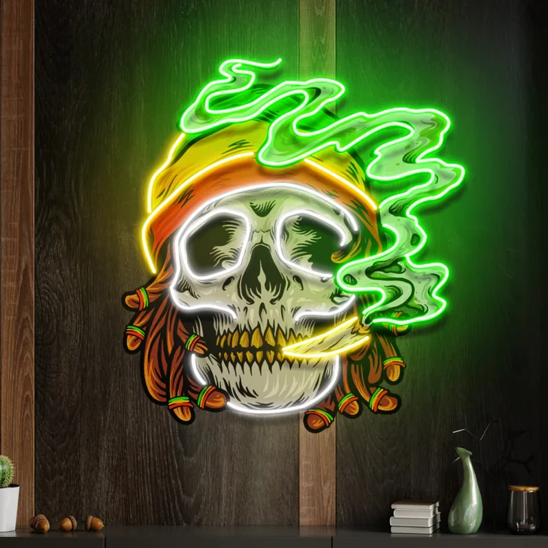 SMOKING RASTA MONKEY SKULL SMOKING LED NEON SIGN (23.5 X 22.6") Bring island vibes and smoking culture together with the Smoking Rasta Monkey LED Neon Sign (23.5 x 22.6") . Featuring a playful monkey in a Rasta-themed design smoking in bright neon colors , this sign delivers a mix of fun, reggae-inspired style and bold novelty décor . At 23.5 x 22.6 inches , it’s large enough to stand out in smoke shops, head shops, bars, lounges, or man caves , while still fitting easily on walls or windows. Bu