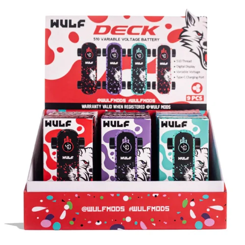 The Wulf Mods - Deck Skateboard 500mAh VV Carto Battery - Display of 9 delivers smooth, potent vapor in a convenient cartridge format. Comes in a quantity of display of 9. Suggested retail price $22.00. Compatible with standard 510 batteries. Available at wholesale pricing from Port City Wholesale.