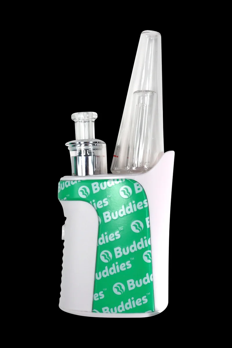 Enjoy your favorite cannabis concentrates the convenient and easy way with the Buddies Toro E-Rig . Made of high-quality materials and featuring overcharge protection, this is one of the safest e-rigs on the market without sacrificing quality. Easy to use and maintain, the Toro will quickly become your best dabbing buddy. This handheld electronic rig is powered by a very capable 1350mAh lithium-polymer battery for long-lasting use. The Toro offers three temp settings accompanied by a light display around the base with white (low), medium (green), and high (red). It also offers tons of convenience with its single button control. This stylish and travel-friendly e-rig taps into advanced technology in its quartz heating chamber so your hits are smooth and flavorful with every draw you take. The slim and discreet Toro fits right in the palm of your hand for fast, on-the-go use.. It can easily be tucked away in your backpack for quick access when you’re out and about. The unit’s water bubbler, atomizer, and carb cap are all detachable and replaceable for easy cleaning and maintenance. With its oyster white body and custom teal midline, the Toro is as striking as its game.
