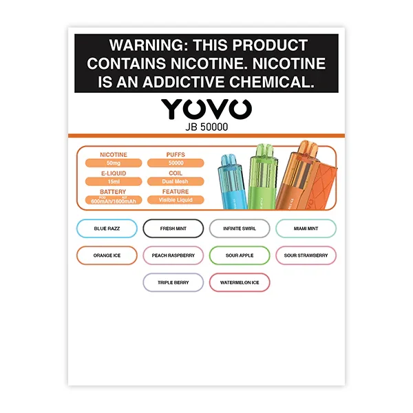 YOVO JB50K MARKETING MATERIALS Showcase the full range of flavors for the YOVO JB50K vape collection with this laminated flavor menu . Designed for durability and visual appeal, this menu highlights the many features of this disposable vape. It is the disposable drives repeat business as the battery is reused. The 8.5" x 11" laminated design is for business owners to educate their customers and ensures the menu withstands daily use in vape shops , smoke shops and convenience stores. It will help your customers easily explore the variety of available flavors. Perfect for in-store displays, this flavor menu adds a professional touch to your vape section. Port City Wholesale vapes , hardware, e-liquids, and alternative products offer great value with bespoke marketing materials for your brick and mortar store. Key Features: Dimensions: 8.5" x 11" Laminated for durability and long-lasting use Features YOVO JB50000 modular vape kit and replacement pods. Displays a full list of flavors for customer convenience Limit: 5 menus per store View more Marketing Materials for all brands here